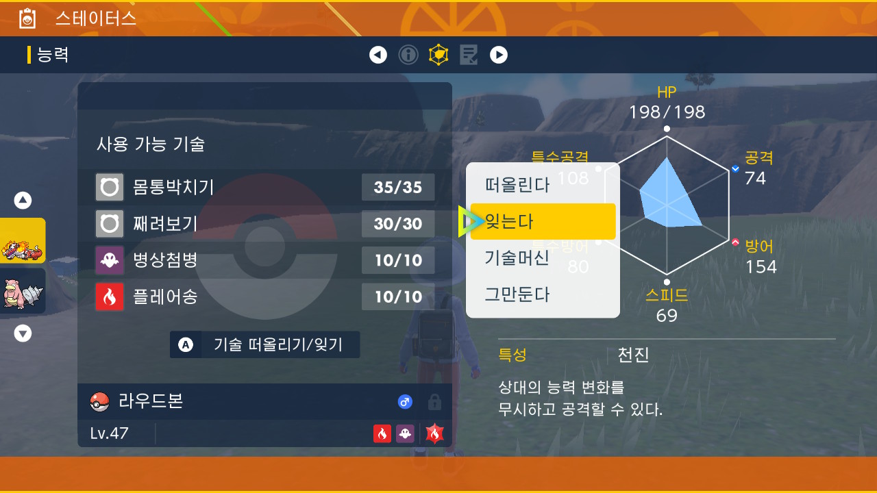 A버튼을 눌러 기술 떠올리기/잊기를 선택한 후