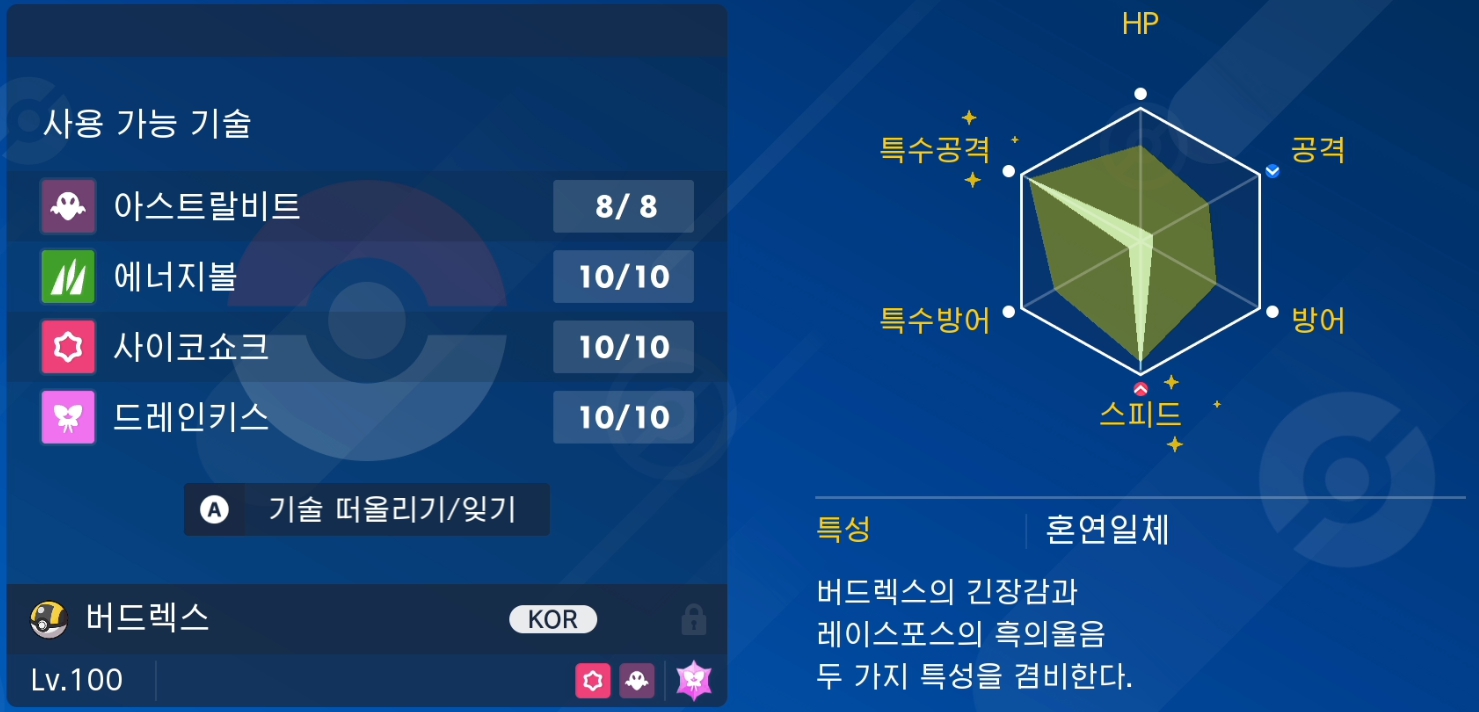 기술배치 : 아스트랄비트, 에너지볼, 사이코쇼크, 드레인키스