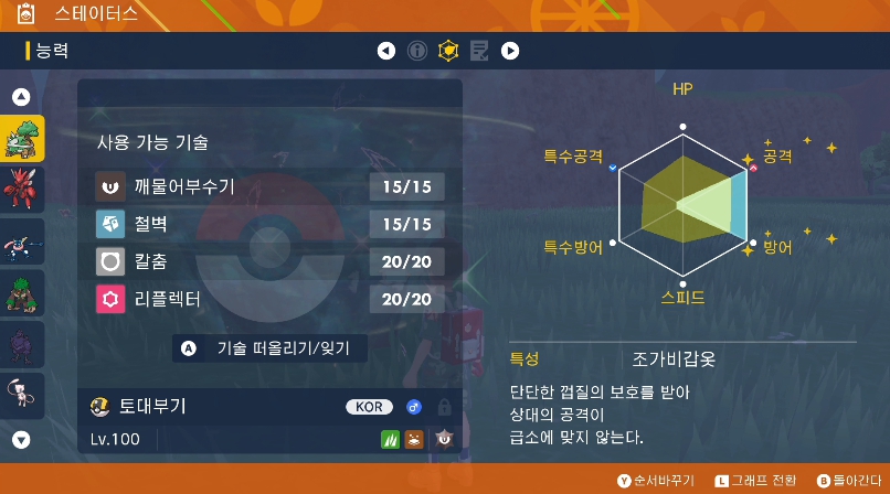 기술배치는 깨물어부수기, 철벽, 칼춤, 리플렉터