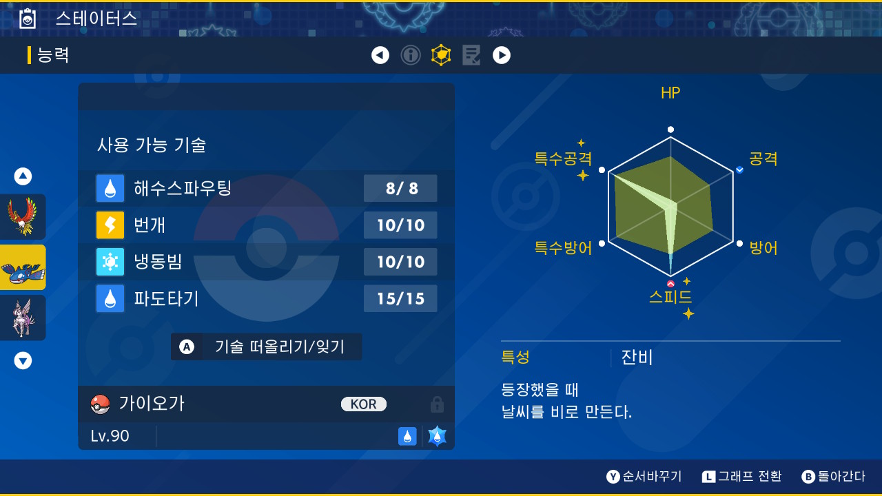 기술배치는 해수스파우팅, 번개, 냉동빔, 파도타기 입니다.