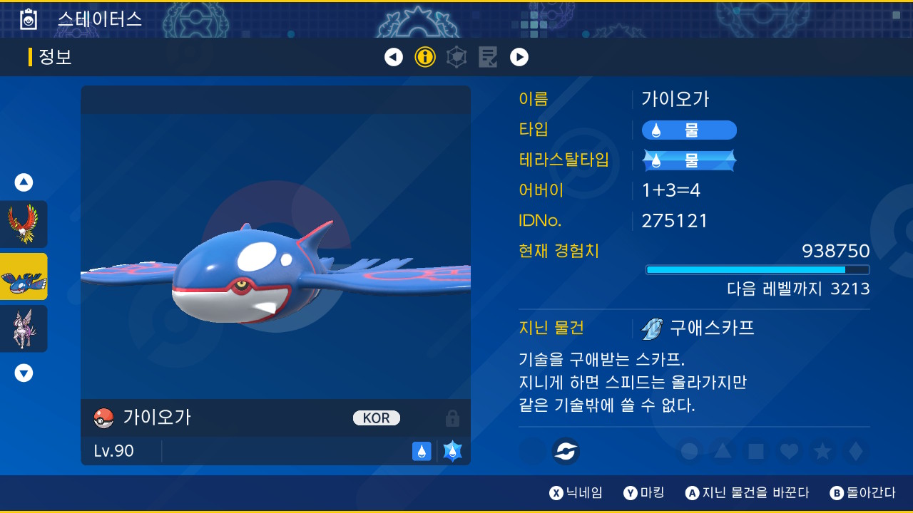 스피드가 높지 않으므로 구애스카프로 보충을 해줍니다.