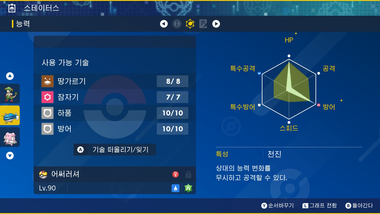 기술배치 : 땅가르기, 잠자기, 하품, 방어