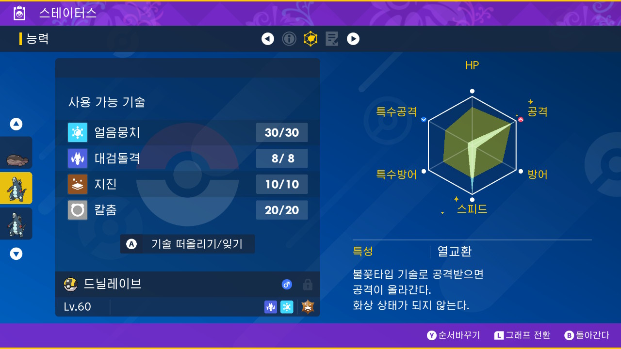 기술배치 : 얼음뭉치, 대검돌격, 지진, 칼춤