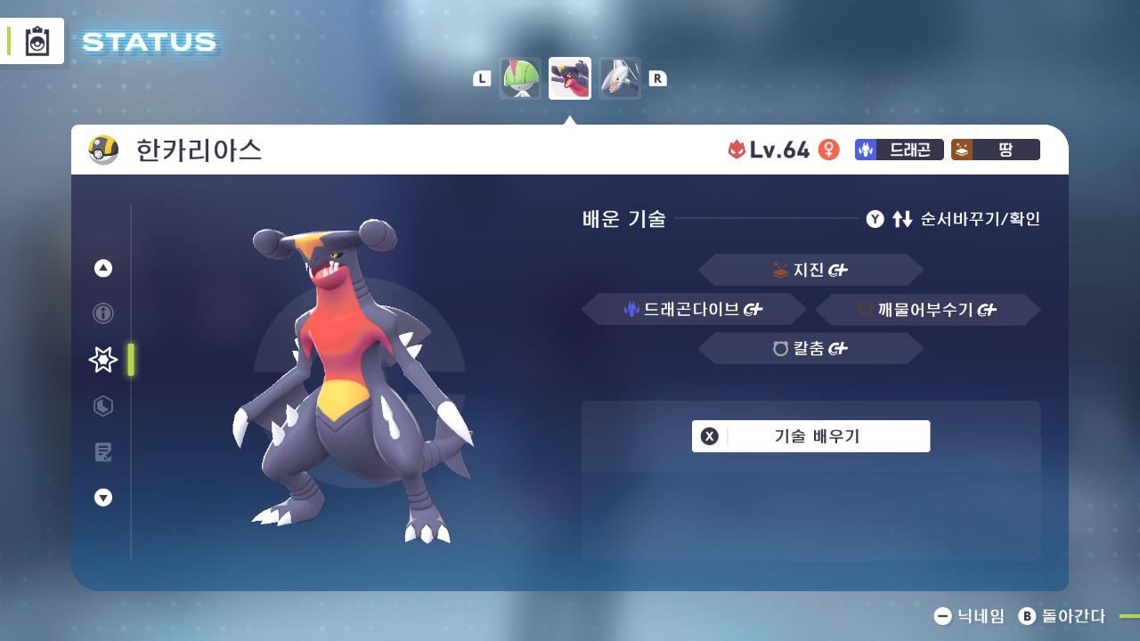 기술배치 : 지진, 드래곤다이브, 깨물어부수기, 칼춤