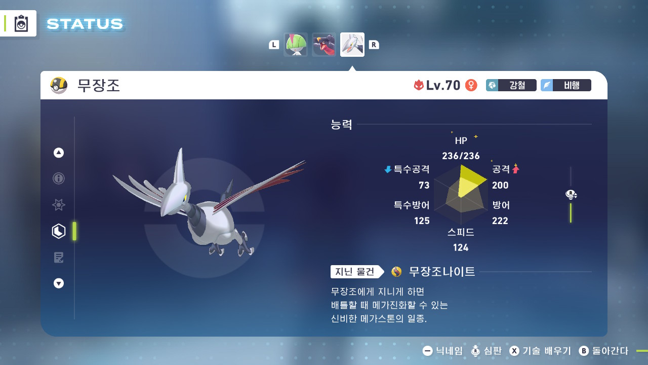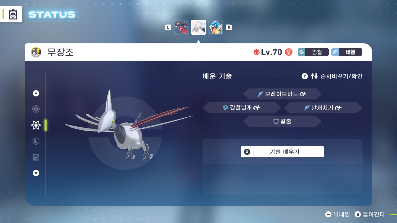 기술배치 : 브레이브버드, 강철날개, 날개치기, 칼춤